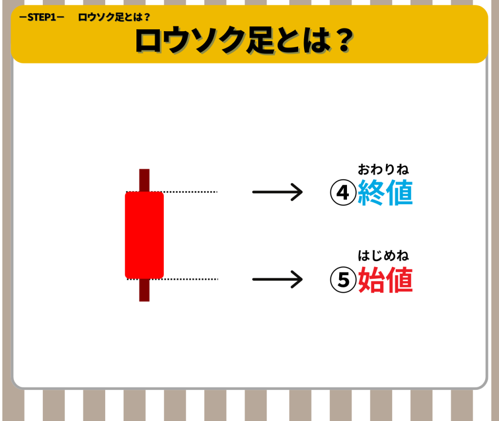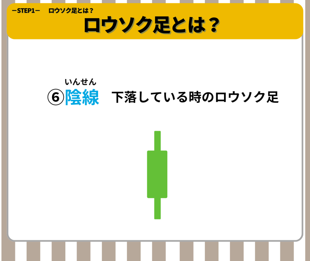 今回は、上昇中に現れる「陽線」を例にして専門用語を紹介しましたが、下落中に現れる「陰線」の場合は「終値(おわりね)」と「始値(はじめね)」が逆になることだけ覚えておきましょう。
