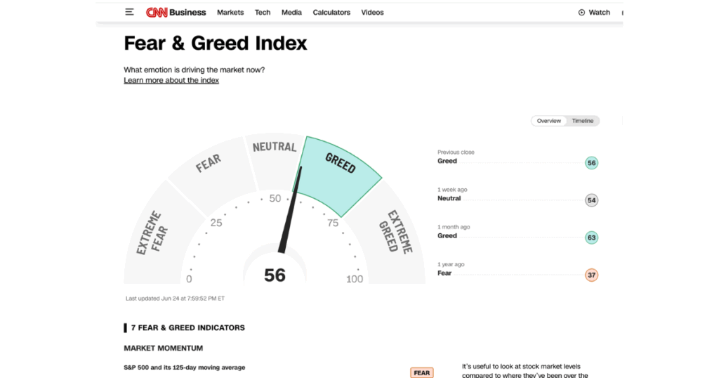 「買うタイミング」「売るタイミング」がわかる参考ツールでは、株価指数取引をする際は僕の中で必須ツールである「フィア・アンド・グリードインデックス」(恐怖と欲望指数)