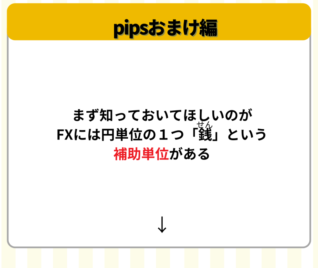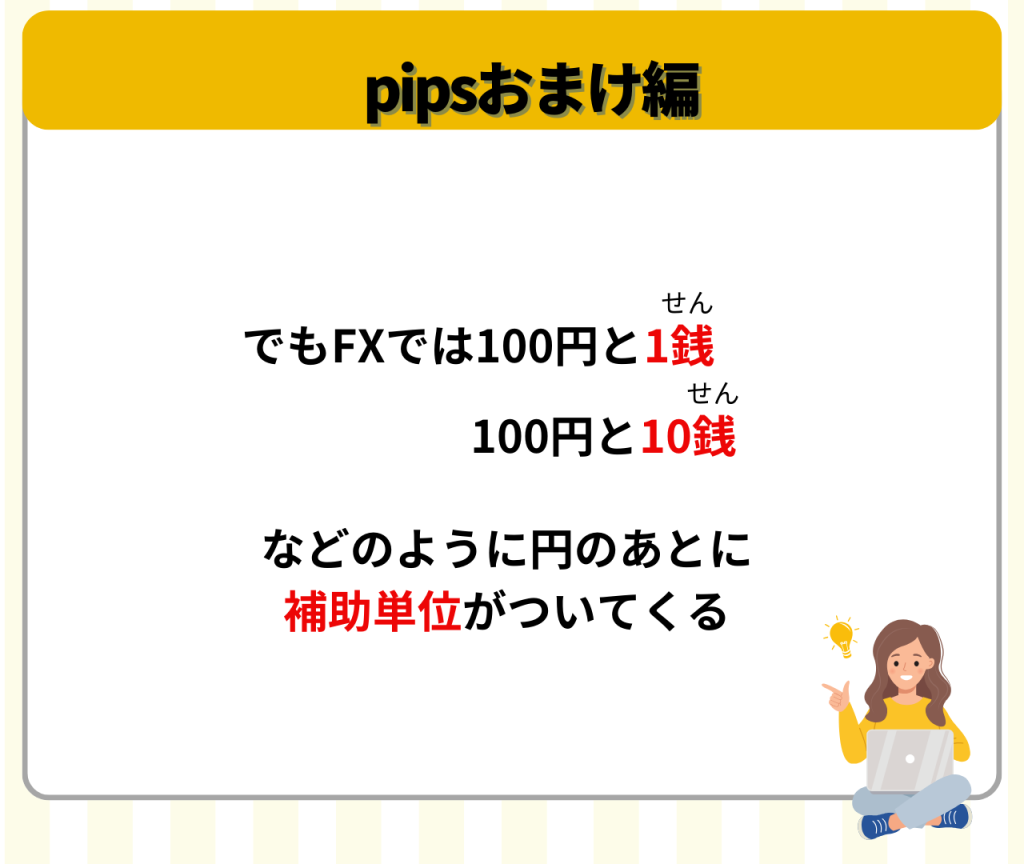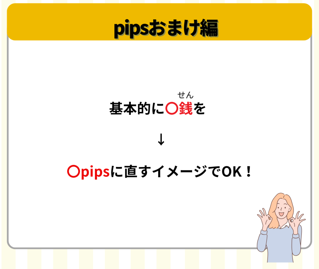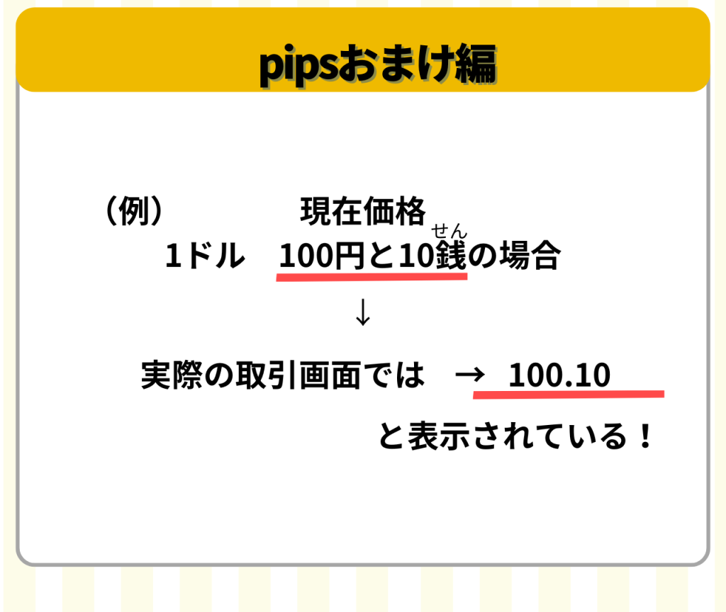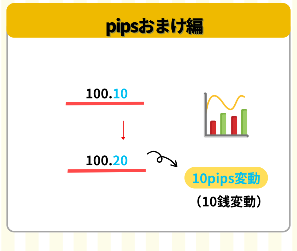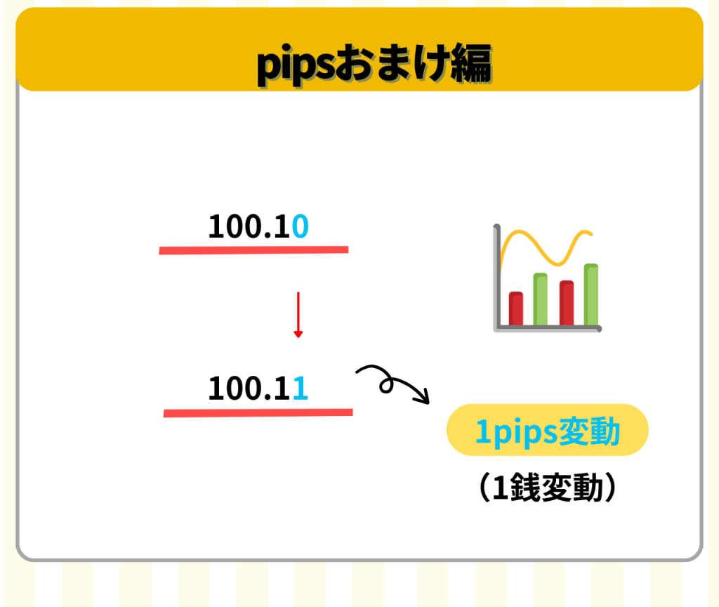 ここでは「銭」というややこしい言葉があるけど、1pips変動したら1番右の数字が動く。10pips目からは1番右から2番目が動くと覚えておけばOK!
