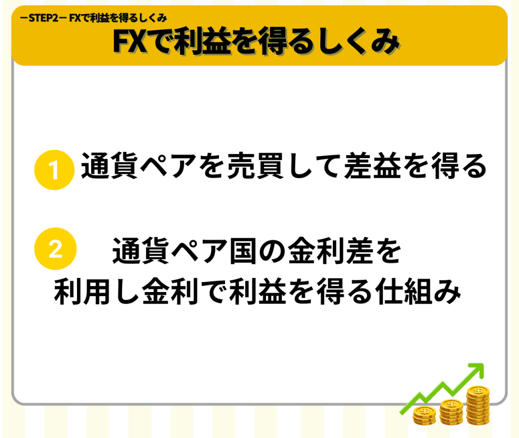 FXで利益を得るしくみは大きく2つあります。