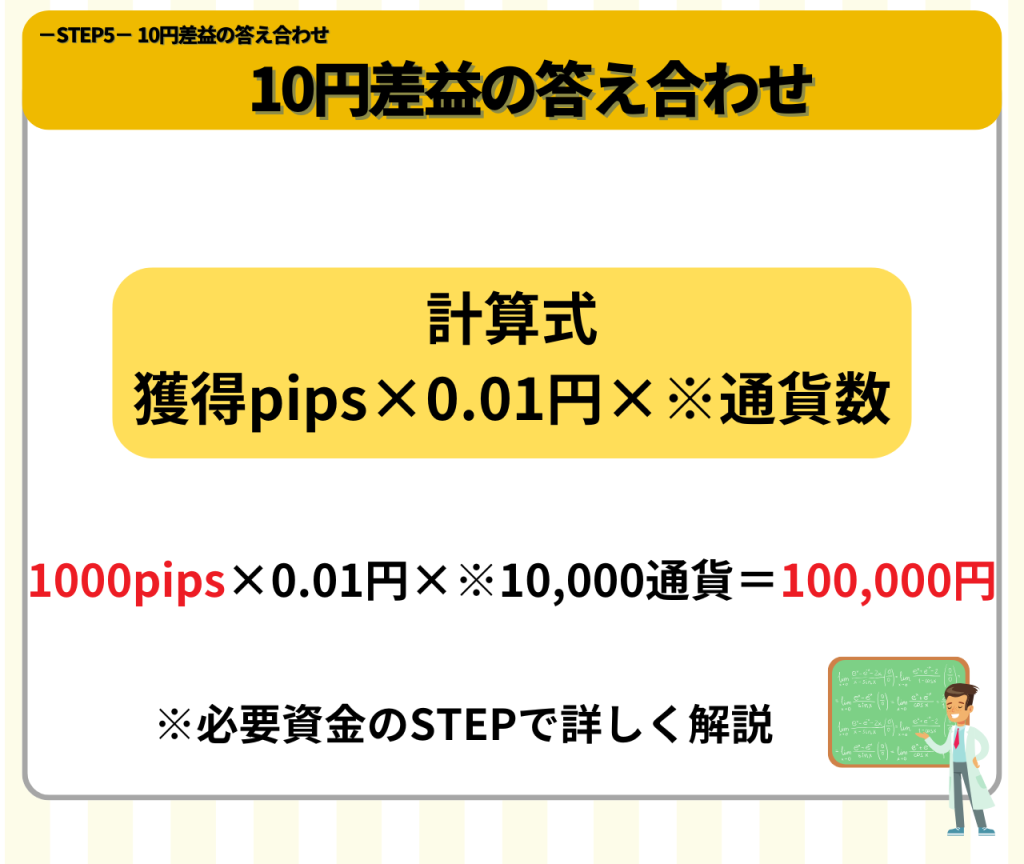 計算式にある獲得pipsとは1000pips(10円)になります!