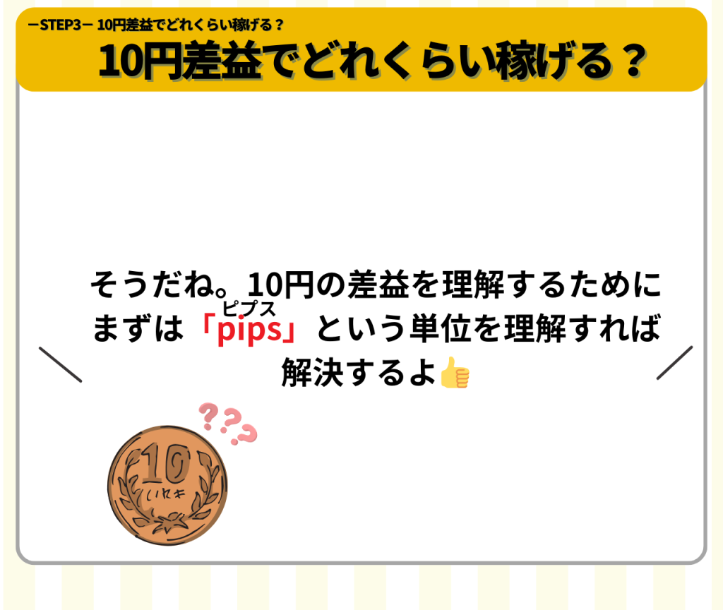 ここで、初めての専門用語「PIPS(ピプス)」がでてきました!PIPSとは、FXの専門用語で主に利益がどのくらいでているのか?を表す単位!STEP4ではPIPS(ピプス)の重要性をもっと深堀っていくよ!