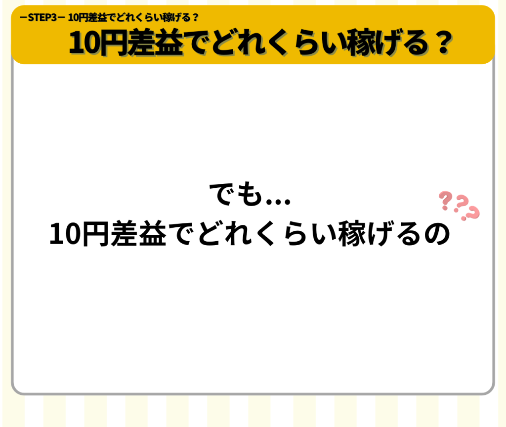 でも、10円差益でどれくらい稼げるの?という疑問が出てくると思うので、ここからは「10円差益でどれくらい稼げるのか?」を一緒に見ていきましょう。