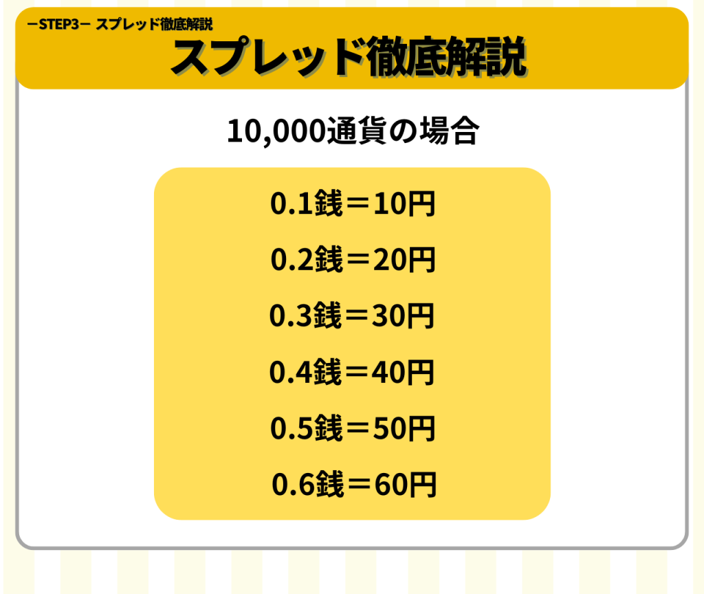 スプレッドは証券会社及び通貨ペアによって異なり、例えばA証券会社が提供している「ドル/円」取引をしたい場合は0.2銭のスプレッド(手数料)を支払ってください。B証券会社が提供している「ドル/円」取引であれば0.5銭のスプレッド(手数料)を支払ってください。という認識で大丈夫です。