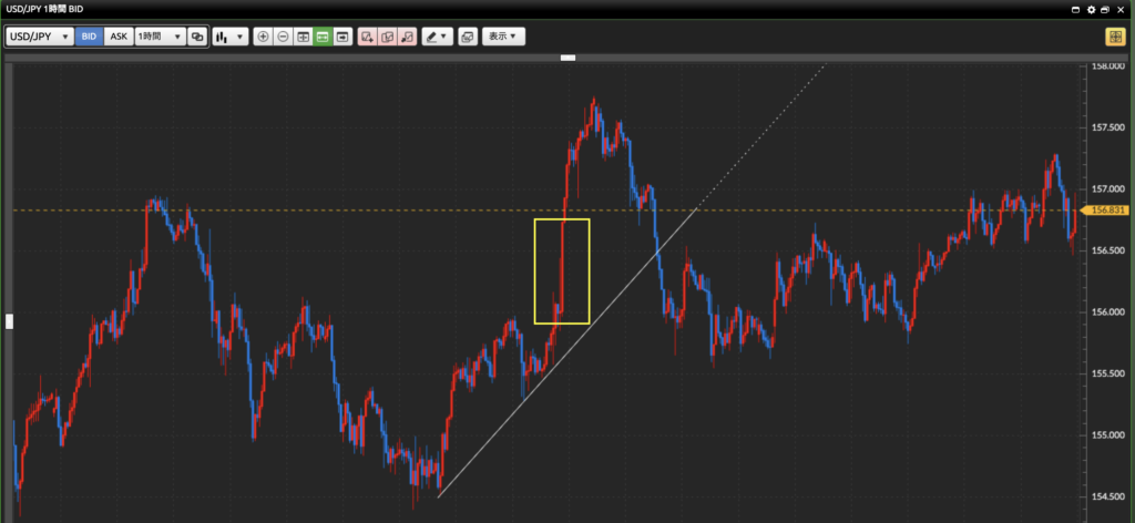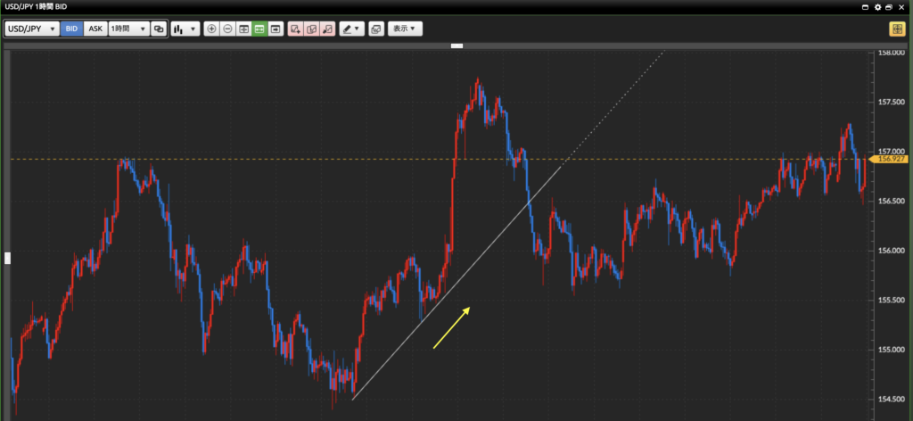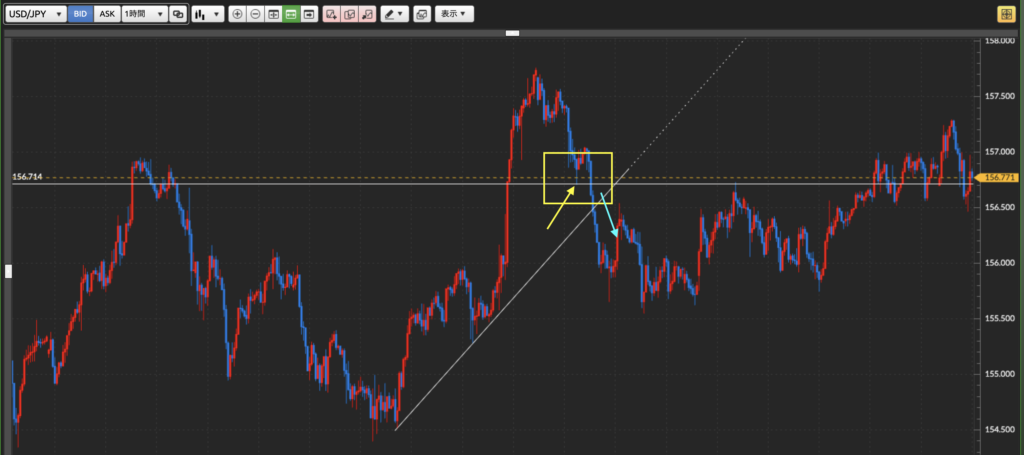 今回の過去チャートでは、「156円714」付近を下回れば相場の転換点になりやすいと考えているので、この水平線を越えて「陰線確定」したらエントリーチャンス。という考え方になります。