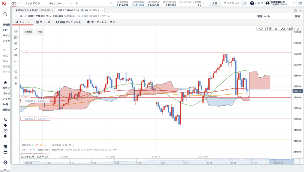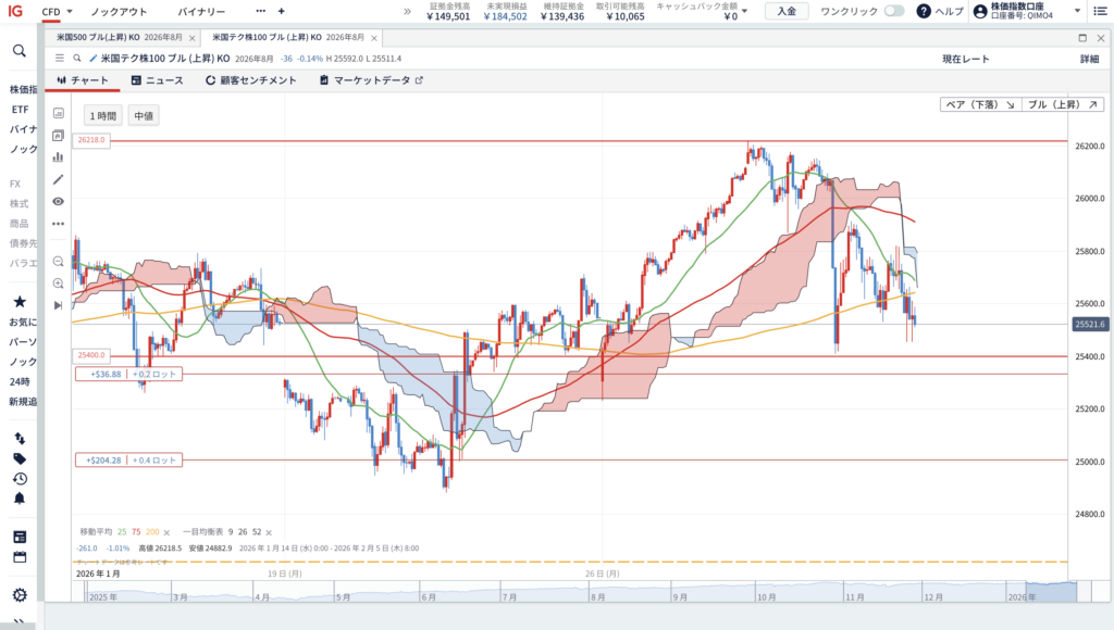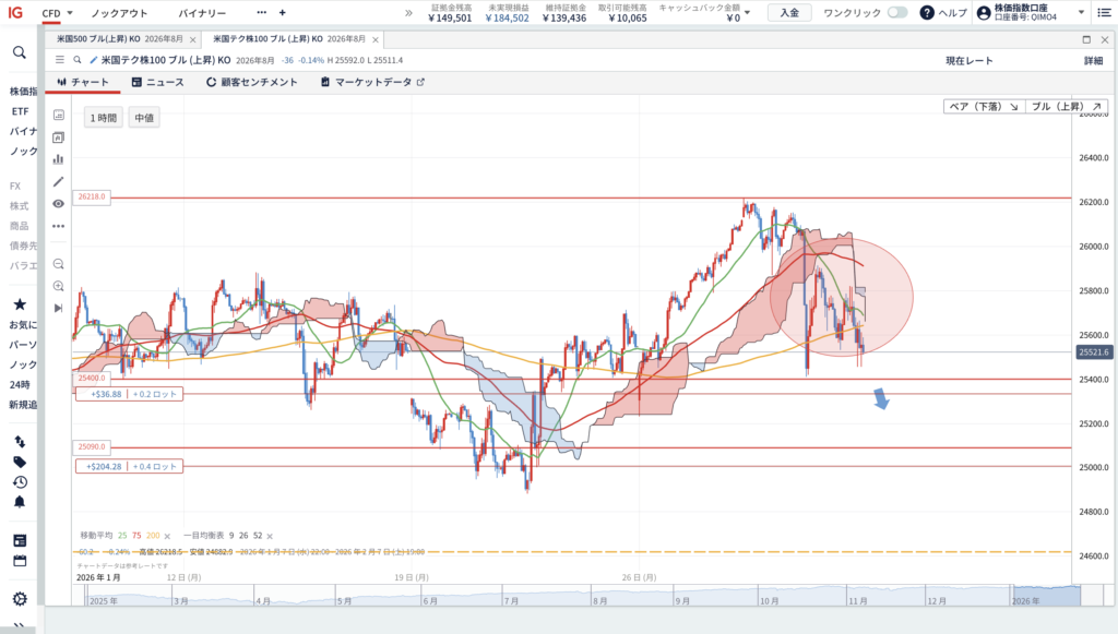 ①1時間足レベルで移動平均線25MAと75MAが200MAを下回りデッドクロスを形成後、一目均衡表の「下落雲」にローソク足が侵入すれば買いシグナル点灯。その時には恐らく「25,400ポイント」を下回った下落をしているのでNASDAQ100は割安と分析。