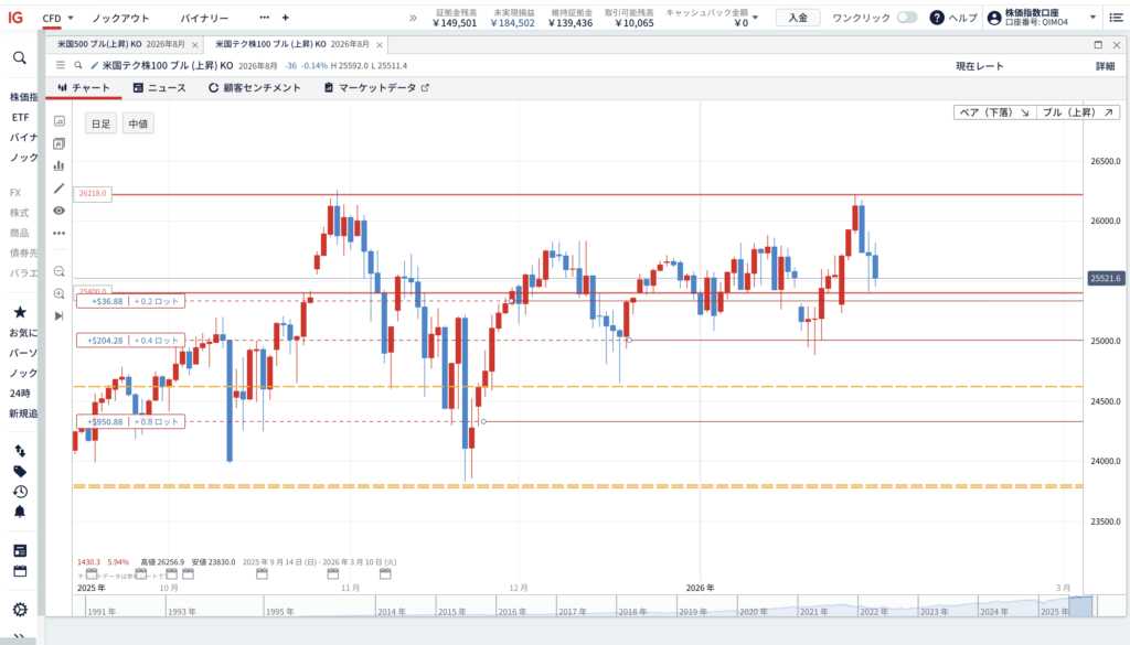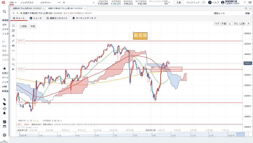 現在、ナスダック100の日足では「26218ポイント」が直近高値になり、