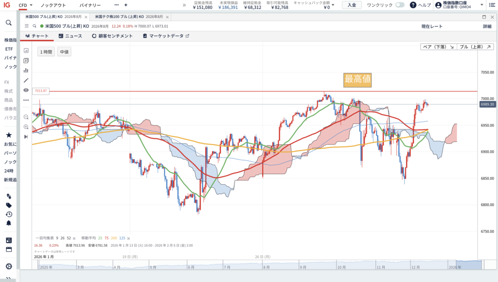 理由としては、いつもなら移動平均線25MA付近まで様子を見るのですが、今回はS&P500がすでに直近高値にいること。基本的にNASDAQ、S&P500は似たような値動きになるのですが、今回はS&P500の想定外の上昇に伴い、単純に乗り遅れたくないという考えです。